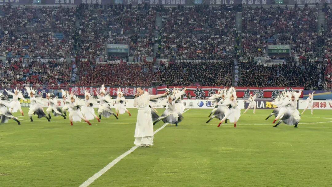 盐城把“文化家底”搬进了球场,在15分钟的篇章里,盐城的文化元素如海浪般层层递进,湿地风光、海盐文化随花车巡游缓缓铺开,淮剧以原汁原味的唱腔展现非遗的魅力,杂技表演招招惊险刺激,航天表演科技感十足,“太空漫步”把日月岛元素生动地搬到了比赛现场。朱哲琴专程来到球场,倾情演唱成名曲《一个真实的故事》。